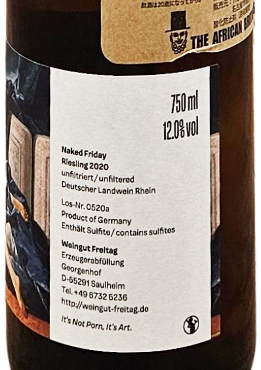 ワイン名のネイキッドフライデーとは、名字のフレイタグは英語のフライデーを意味し、ナチュラルなワインということで生=裸という意味合いを込め、週末の仕事終わりの金曜日は、リラックス時間の始まりということで、ネイキッドフライデーのワインで楽しく始めてほしいという彼のユニークな発想からきており、ジューシーで複雑でなく楽しいワインを造りたいという思いを込めています。