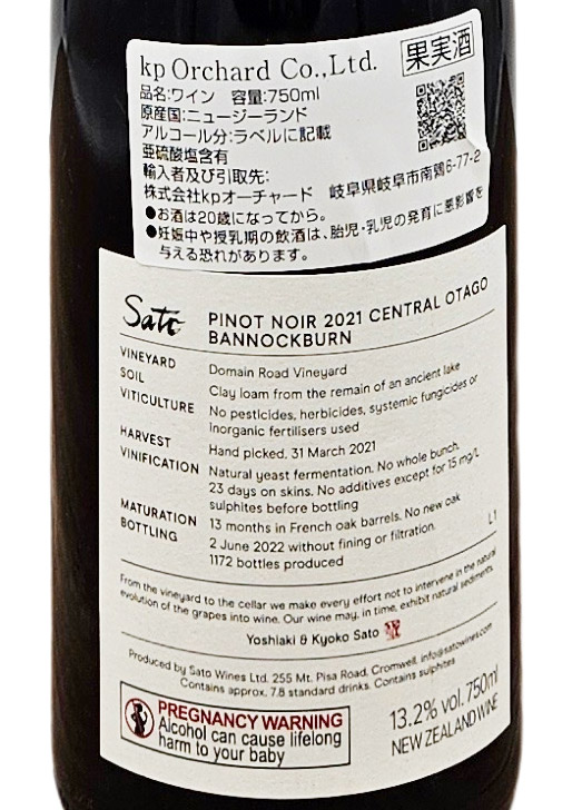 Sato Pinot Noir Bannockburn / サトウ ピノ・ノワール バノックバーン 2021