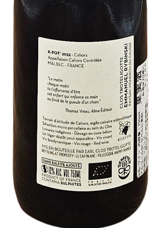 エマニュエル・リビンスキーはこのユニークなテロワールの特徴に注目し、鉄分含有率によって畑を細分化し、それが品種マルベックに与える表現の変化を、「K」「K2」「K-POT」というAOCカオールのワインに反映させました。