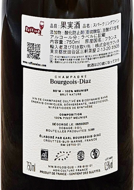 キュヴェ名の“BD”は“ブルジョワ・ディアス”を、“M”は“ムニエ”を表しており、古樹のムニエ100%の単一品種キュヴェです。